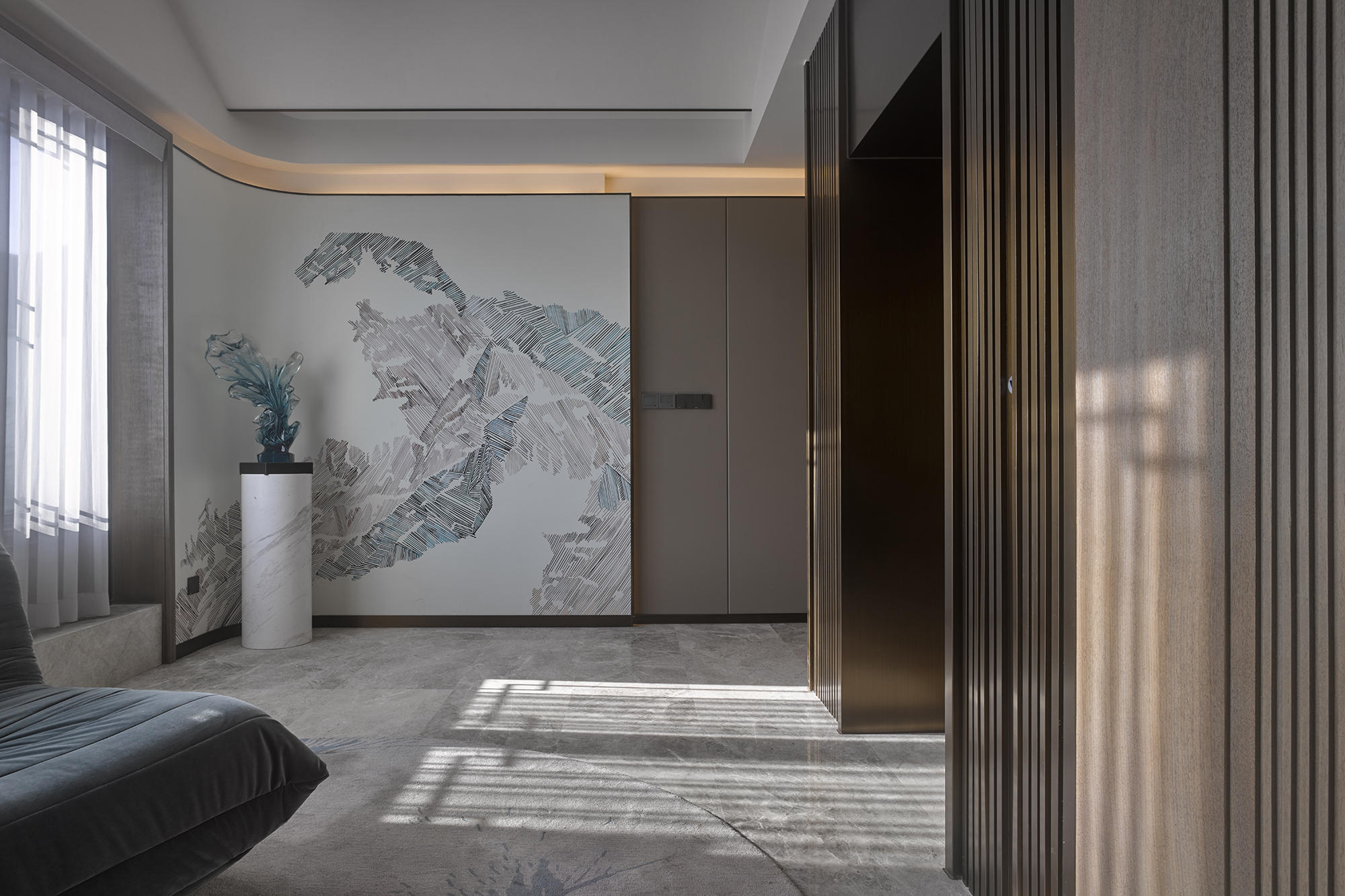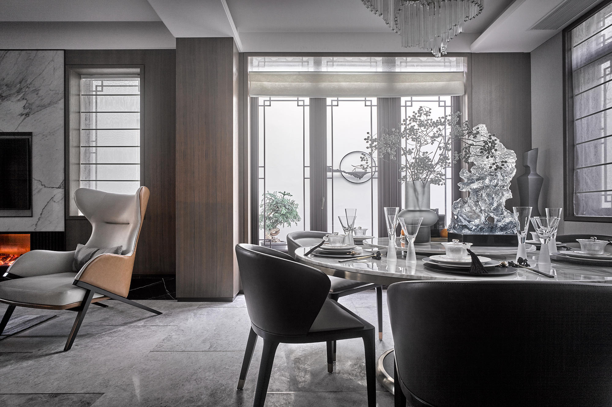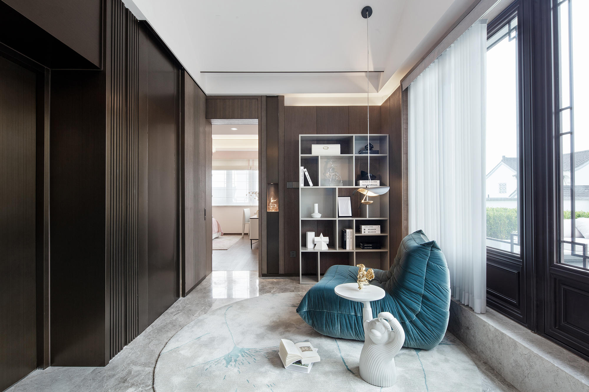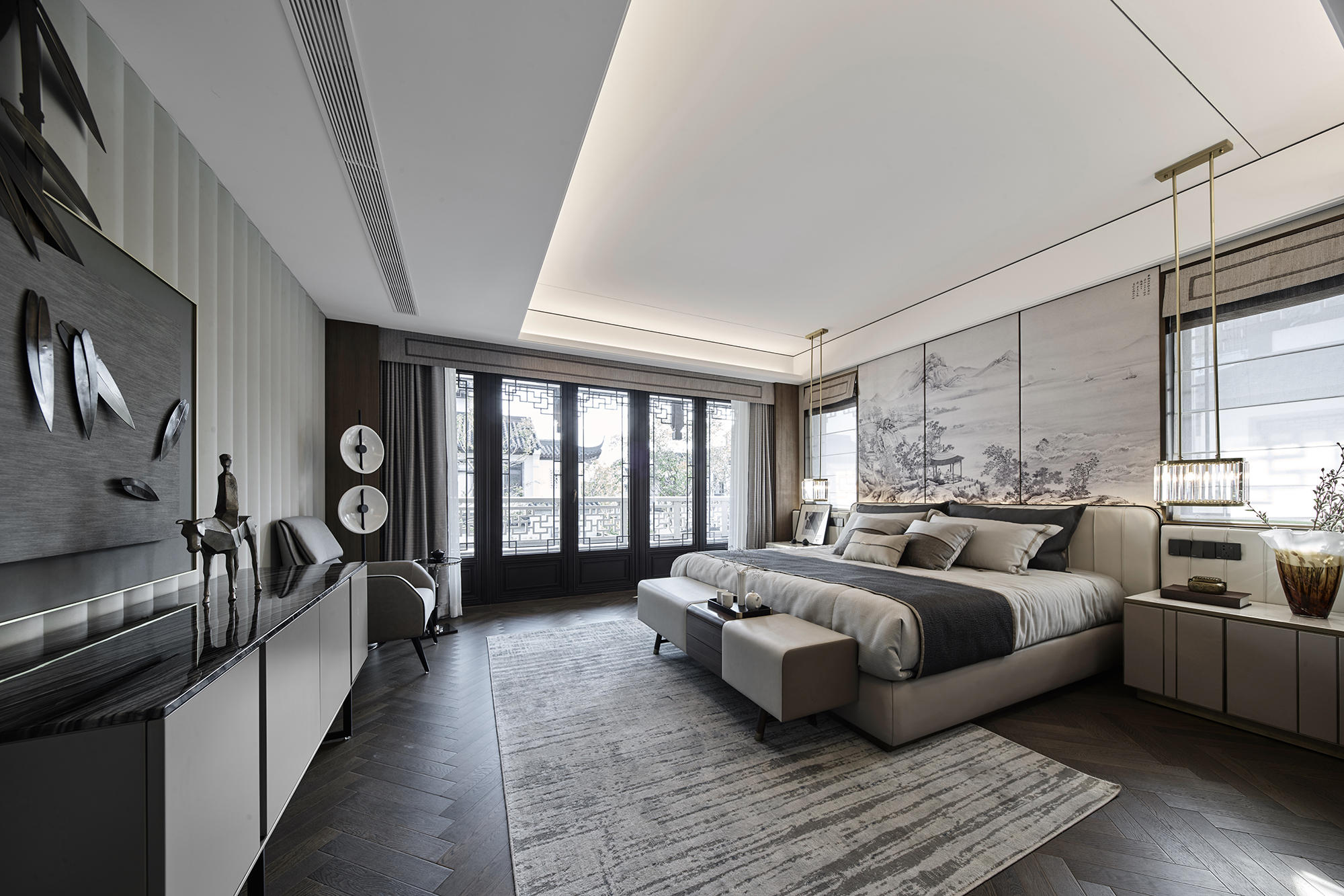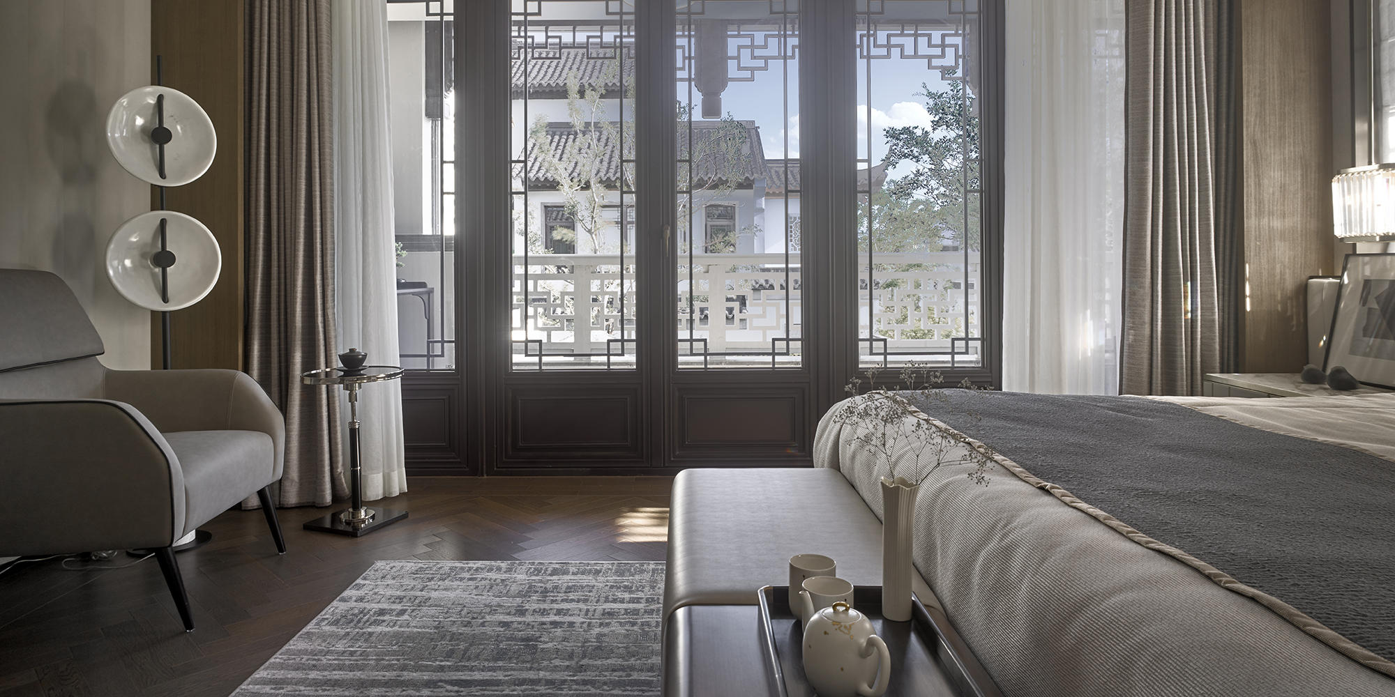 眺望富春江,背倚黃公望國家森林公園,綠城·富春玫瑰園以賦予有無相生、道法自然的東方哲思,匠心創(chuàng)作出遵循中式美學(xué)內(nèi)涵的庭院居所,隱逸生活映現(xiàn)于世。