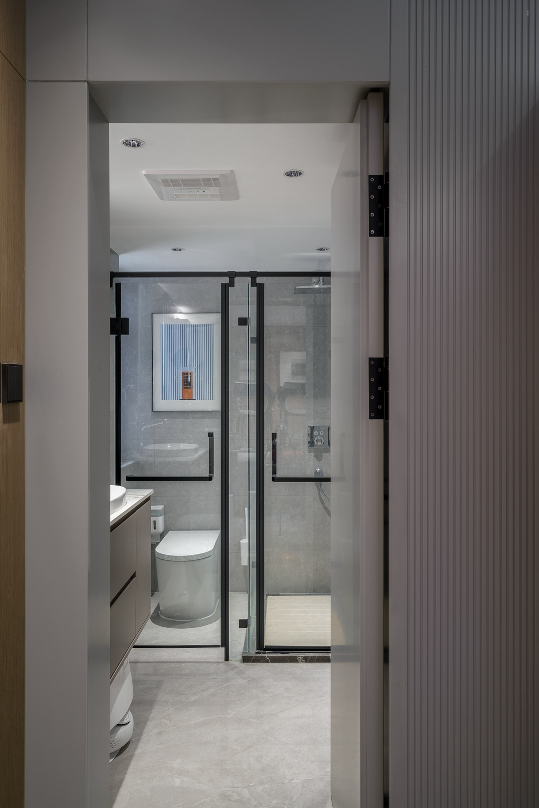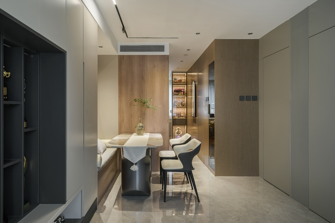 設計策略: 1、原始戶型客餐廳面積緊張,在配色上以淺色為主,局部點綴亮色和深色。 2、全屋進行“隱形式”設計,將門弱化,達到放大空間的效果; 3、衛生間過小,無法滿足日常使用需求,縮小主臥空間,擴大衛生間面積,實現三分離; 4、全屋做到頂儲物柜,滿足收納需求;