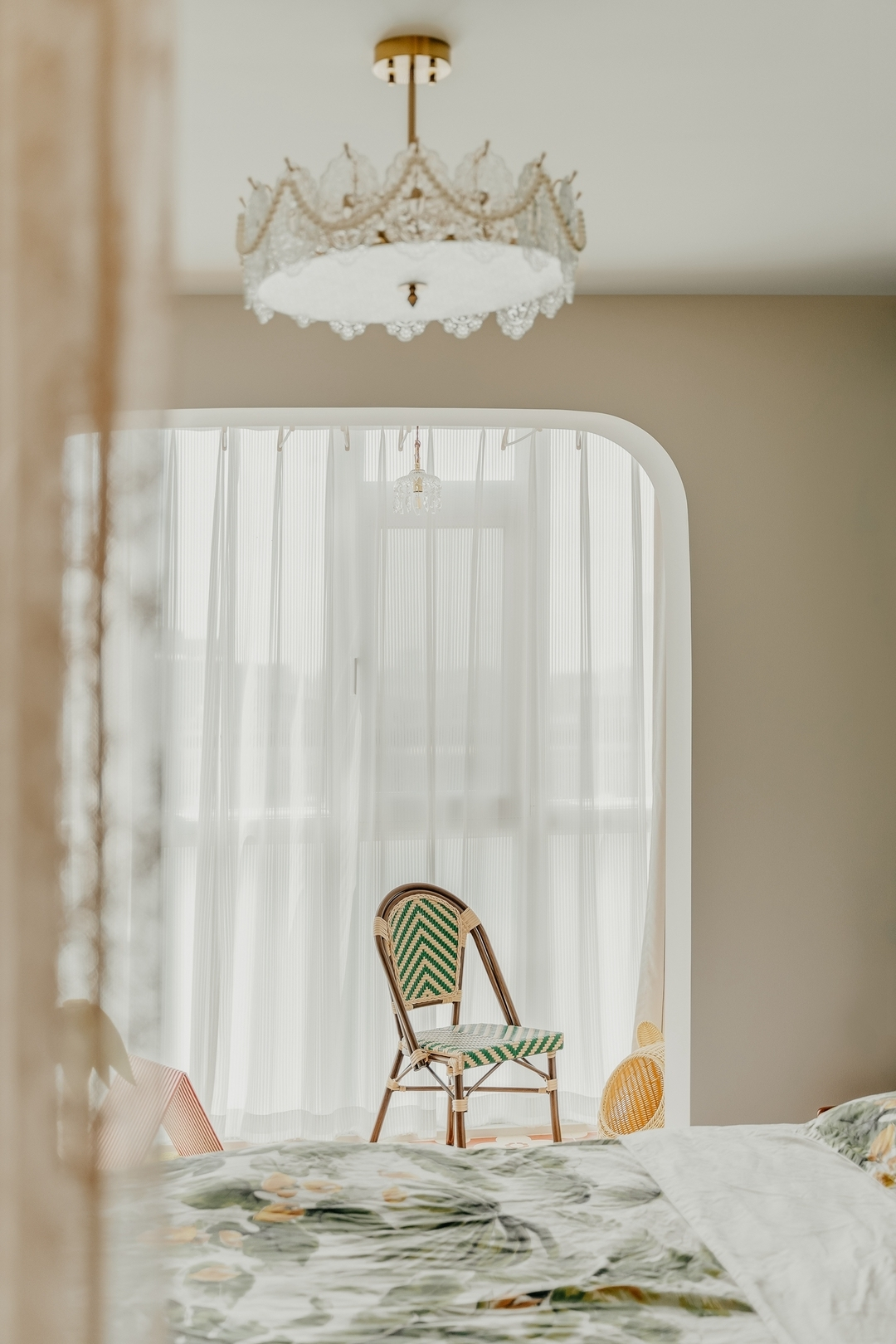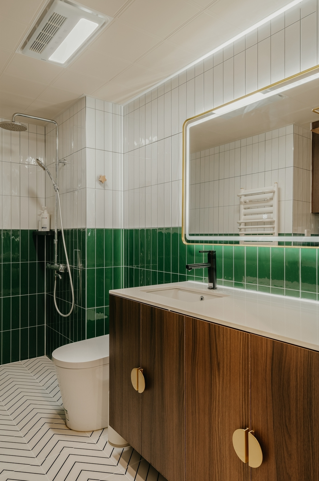 設(shè)計(jì)策略: 1. 原有衣帽間封閉無采光,打通臥室與衣帽間,更顯空間通透 2. 擴(kuò)大衛(wèi)生間面積,做干濕分離設(shè)計(jì) 3. 改變?cè)斜容^方正的格局,加入弧形元素 4. 在色彩上使用濃郁的復(fù)古綠為主色調(diào),為空間注入靈魂