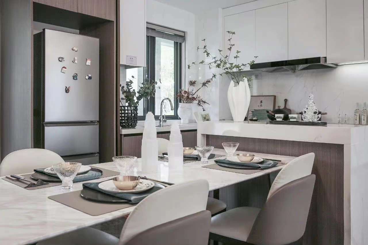 這個70㎡米二房戶型市面少有,是專為常態化的三口之家所準備。雖不大,但一應俱全。 客餐連體的格局下,餐廳運用光帶圍繞勾畫原木木飾面的手法輕松將客餐廳區域合理分割,也提亮了光線。 客廳大理石電視墻桌材質簡練,形成一體,黑白色調樸素分明,彰顯“后浪”練達風格!